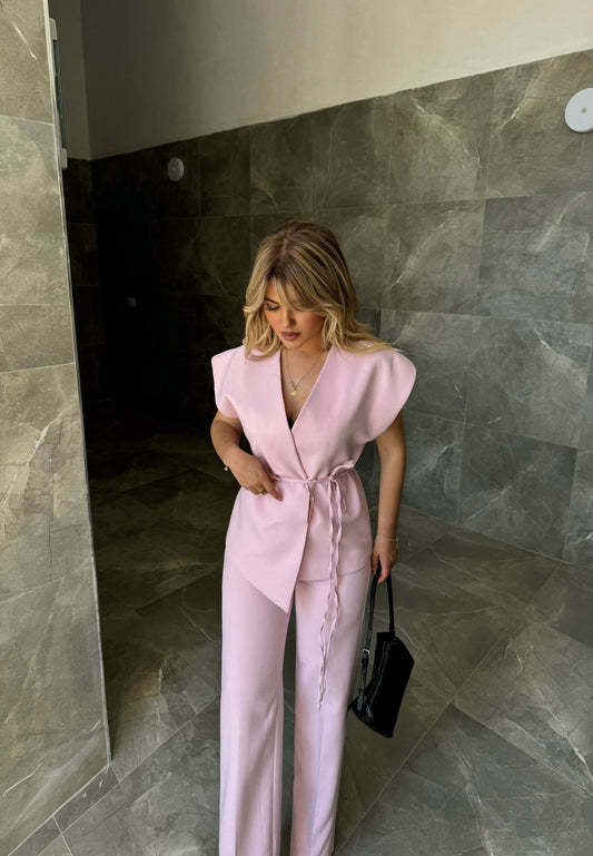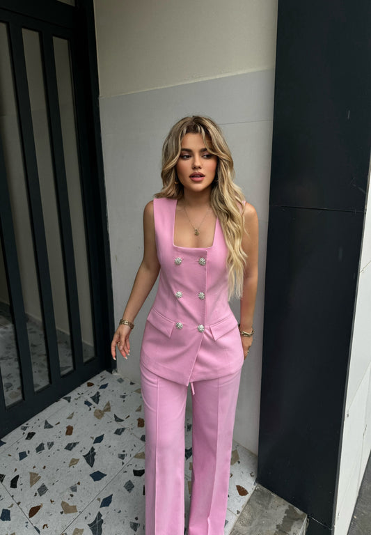 Kostum klasik me dy pjese. Eshte me jelek me kopsa me gure para dhe pantallona...