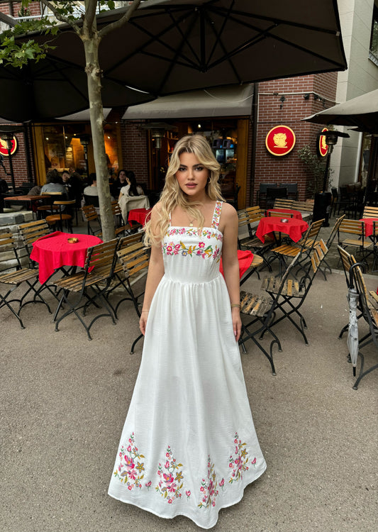 Fustan i gjate me detaje me lule. Ka material te plote dhe cilesi fantastike.