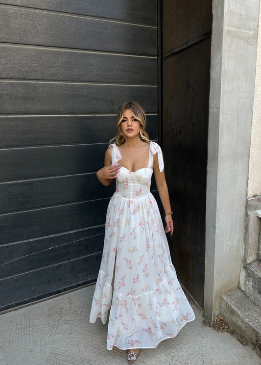 Fustan i gjate me te care anash. Eshte me motive me lule te vogla. Mbyllja...