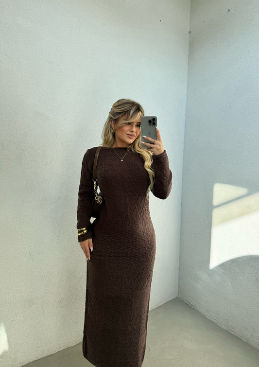 Fustan i gjate ne ngjyren kafe. Vjen ne material te trikotuar dhe astar poshte. Teper...
