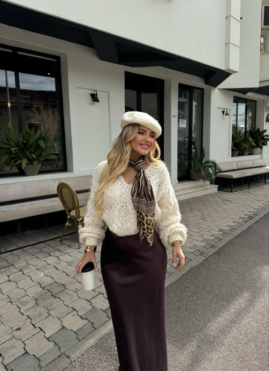 Pulover bezhe me fjongo te vogla para. Vjen ne gjatesi normale. Ka material te plote...