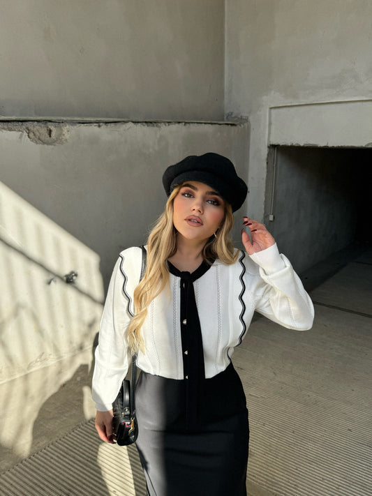 Pulover gjatesi normale me lidhese ne qafe. Ka kopsa figurante ne ngjyren gold. Material i...