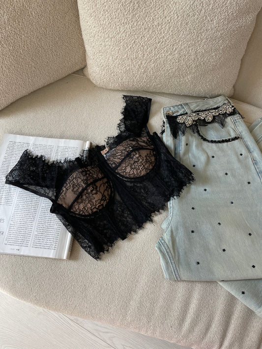 Crop i shkurter me zinxhir ne pjesen mbrapa. Eshte me dantelle dhe lehtesisht i kombinueshem....