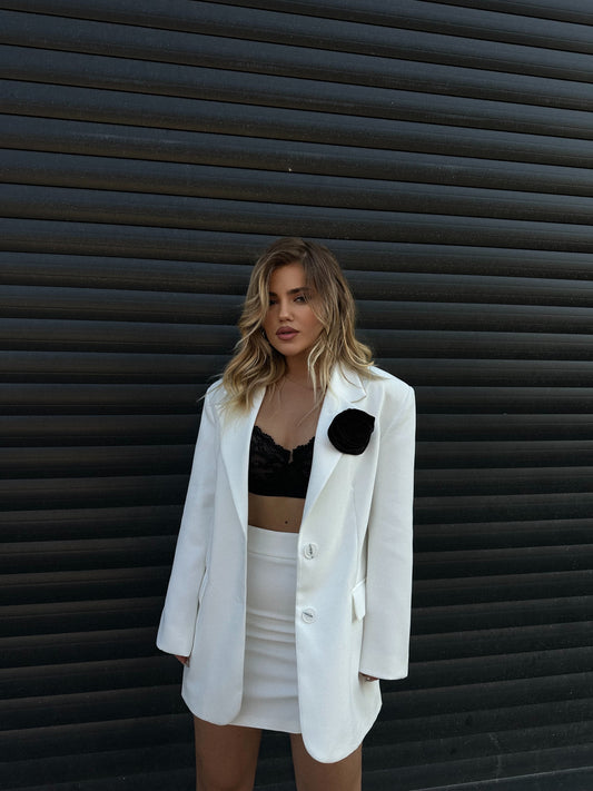 Kostum i bardhe klasik i perbere nga xhaketa e drejte me kopsa te zeza dhe...