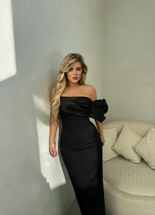 Fustan i zi. Fustan i gjate ngjyre e zeze, me material saten ne pjesen e...
