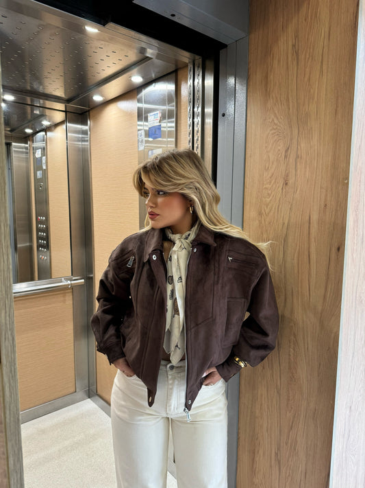 Xhaket e shkurter ne ngjyren kafe, material eshte kamosh vjen me xhepa ne pjesen perpara...
