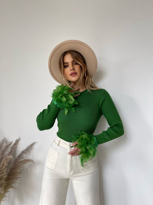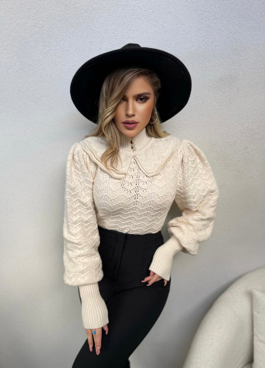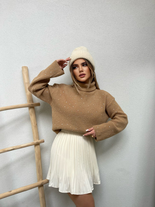 Pulover me perla tek qafa, me punime te veçanta. Ka pjese golfi e cila mberthehet...