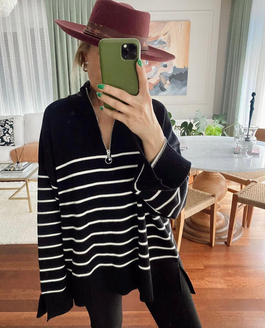 Pulover me jake me zinxhir me menge te gjata. Pulovra ka gjatesi. Me viza horziontalisht...