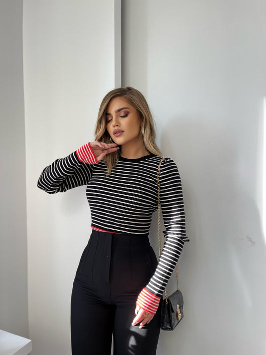 Bluze e shkurter me viza me menge te gjata me jake rrethore. Bluzja pershtatet sipas...