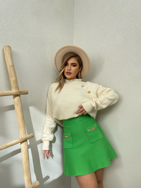 Pulover me menge te gjata me kopsa ne pjesen e supit me jake dantelle. Menget...
