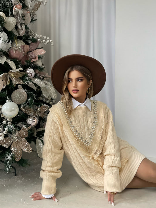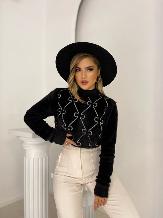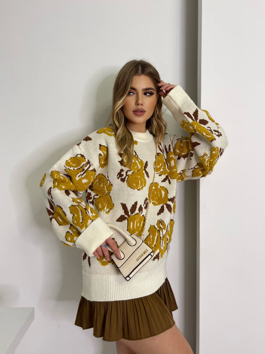 Gjysem-golf me menge te gjata me qendisje me topa dhe trendafila. Pulovra ka gjatesi normale...