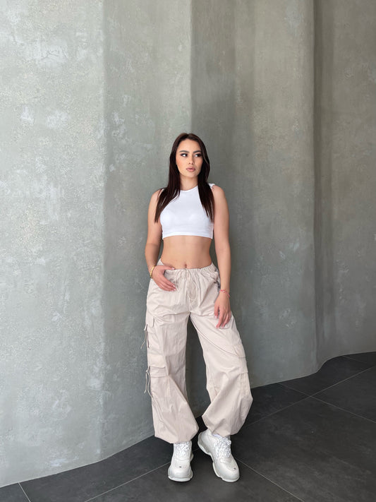 Pantallona te gjera me llastik ne pjesen e belit me xhepa te bollshem ne pjesen...