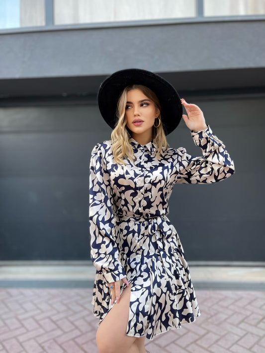 Fustan me lule me menge te gjata me jake me kapak. Mberthimi behet me kopsa...