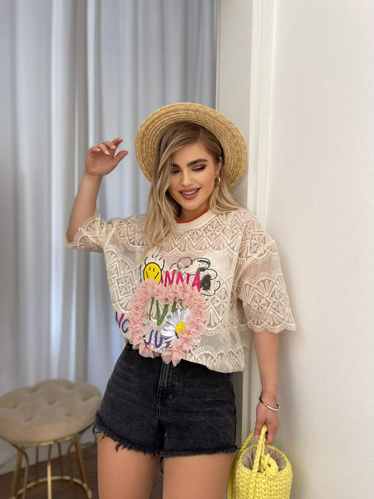 Bluze me rrjete me zemer me krah te shkurtra ka gjatesi mesatare. Me jak te...