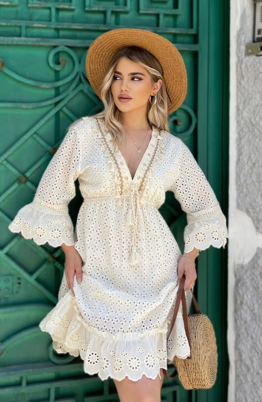 Fustan lino me punim. Dekolte ne form V. Meget poshte te fryra dhe me lidhse...