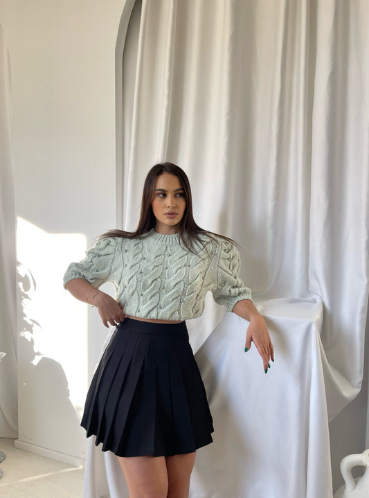 Bluze golf me lidhse ne pjesen e mengeve. Eshte me damar. Pulovra ka gjatesi normale....