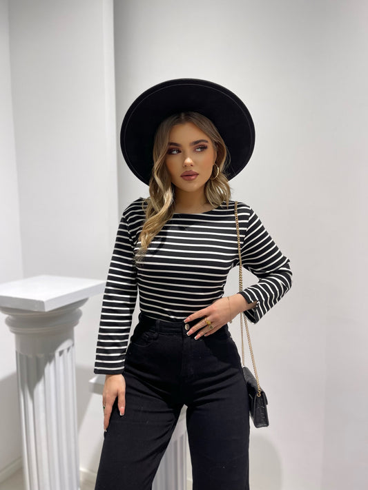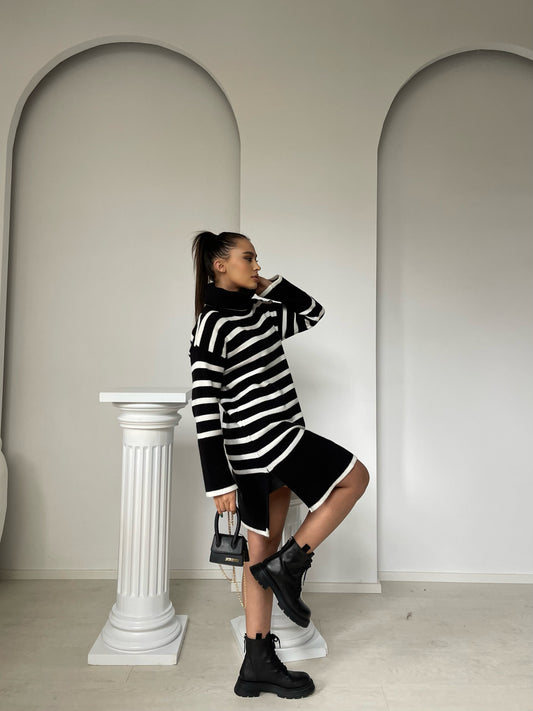 Fustan golf me menge te gjata me viza te bardha. Golfi eshte me gjatesi normale....