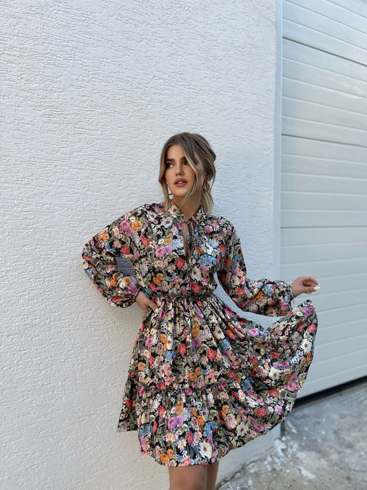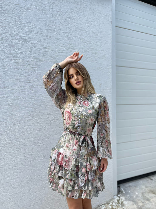 Fustan i shkurter me lule. Fustani ka jake te ulet me lidhje para. Qendron i...