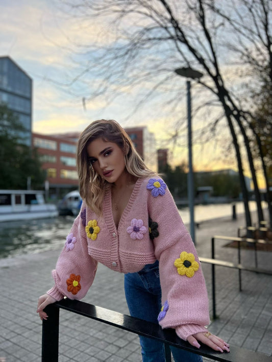 Pulover me lule me menge te gjata. Mberthimi behet me kops ne pjesen e perparme....