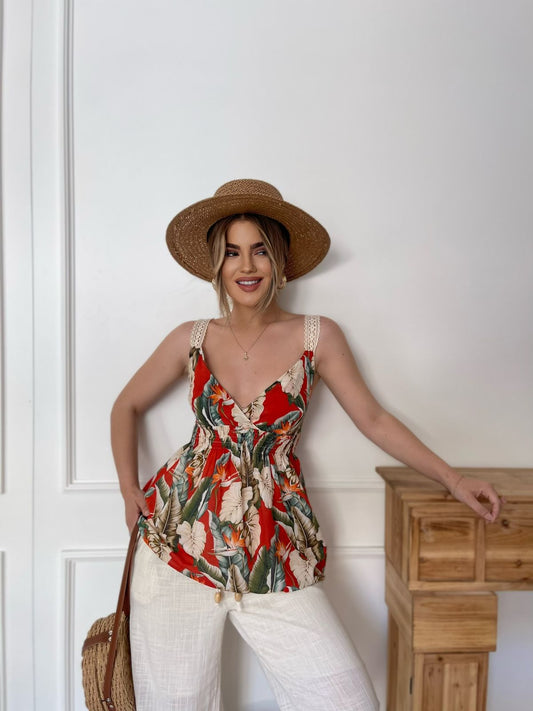 Pantallona te shkurtra me lule. Ne pjesen e belit jane me qemer dhe rrip me...