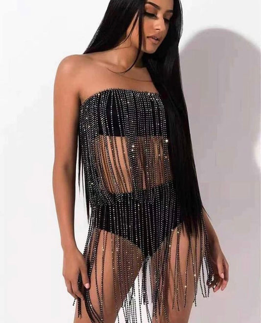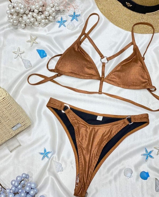 Rroba banjo kafe me shkelqim me togez ne pjesen e perparme te bustit. Me bikini...
