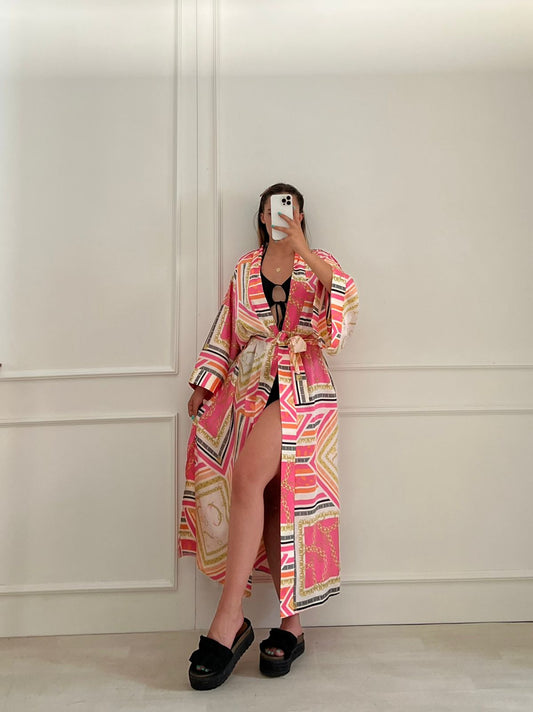 Kimono me nuanaca roze. Me krah te lirshme te gjere. Ka gjatesi mesatare. Mberthimi behet...
