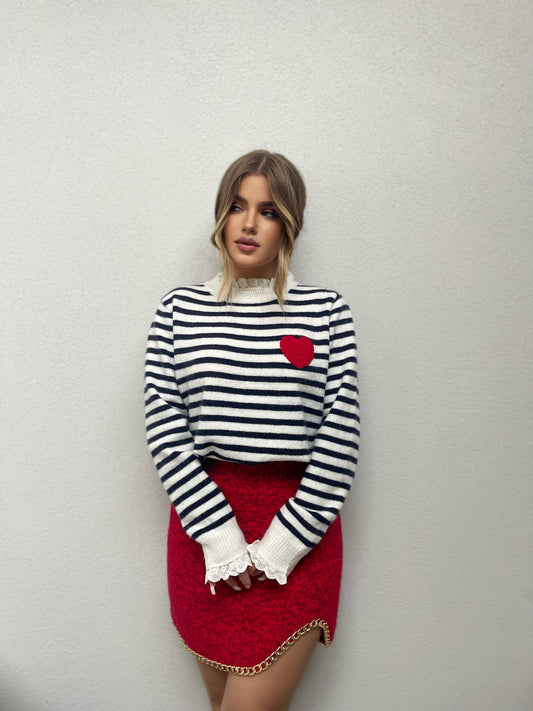 Pulover me viza me jake dantelle. Me jake rrethore. Me gjatesi normale. Me zemer te...