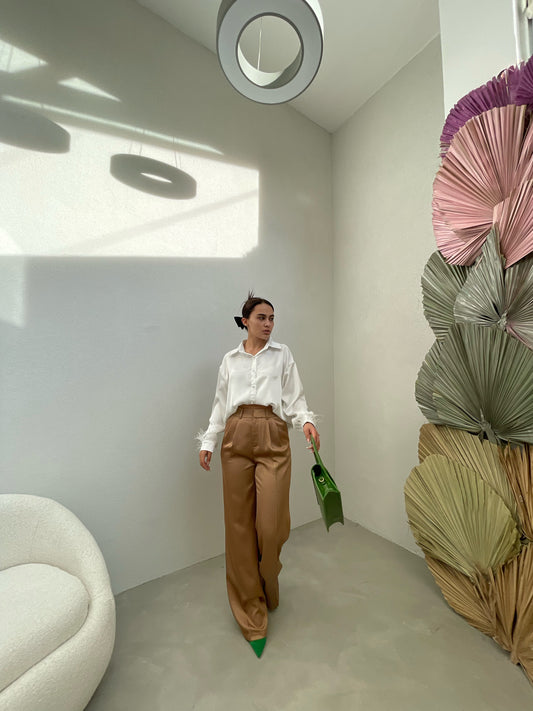 Pantallona te gjera me qemer ne pjesen e belit. Me pencane pjesen e perparme. Me...