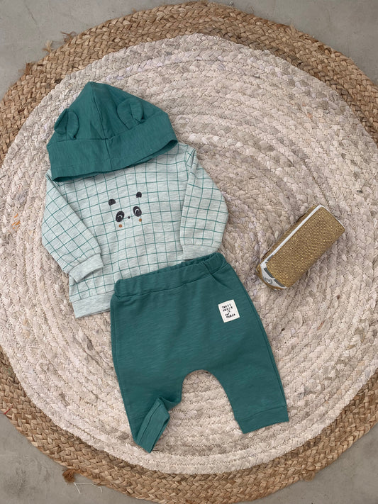 Set per beba .Bluze pambuku me kuadrata dhe me kapuc.Tutat jane pambuk dhe kane cilesi...