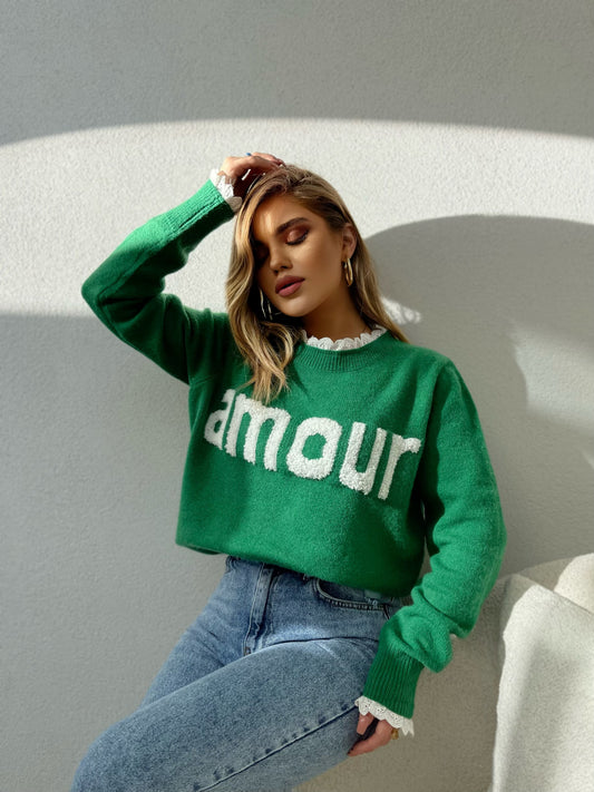 Pulover amour me jake dantelle me menge te gjata dhe dantelle ne pjesen e mengeve....