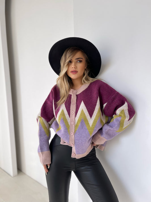 Pulover me motive me menge te gjata me jake rrethore. Mberthimi behet me kopsa ne...