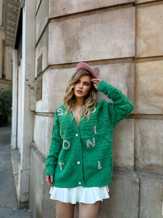 Cardigan me perla me shkronja ne pjesen e perparme. Me jake ne form V-je, mberthimi...