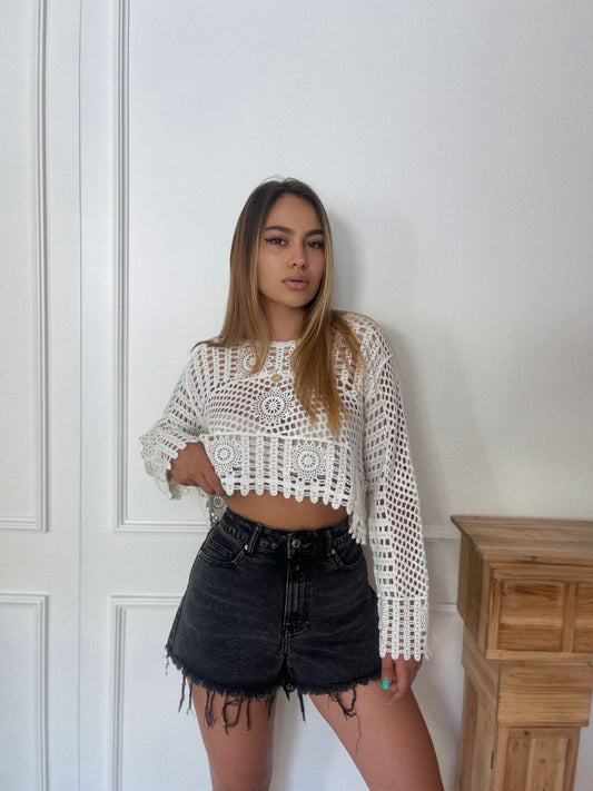 Bluze e trikotuar me te hapur te super. Me menge te gjata me jake rrethore....