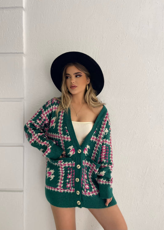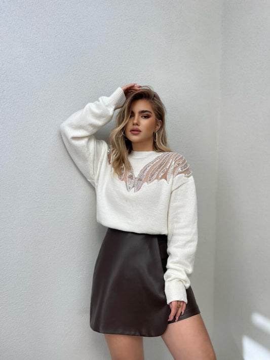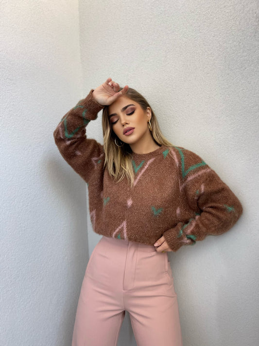 Pulover me shkelqim. Me menge te gjata me jake rrethore me dizenjo abstrakte. Modeli vjene...