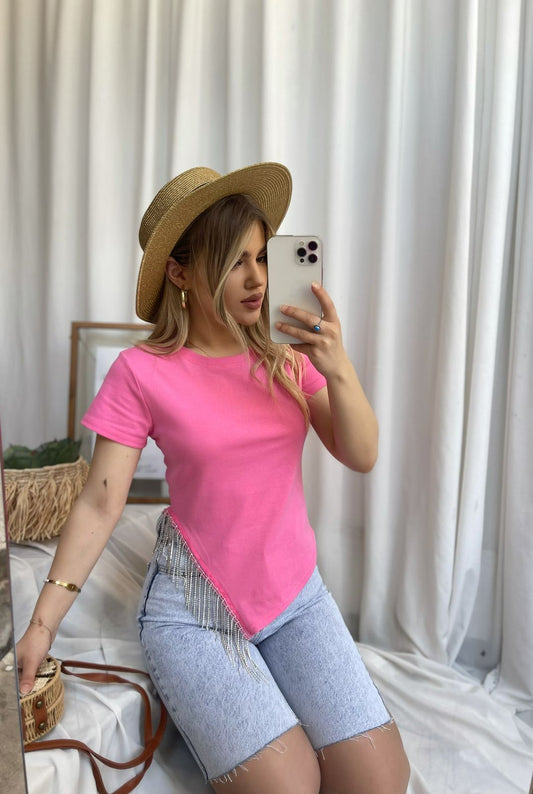 Bluze roze me rripa me gure anash. Me menge te shkurtra. Ka gjatesi mesatare. Lehtesisht...