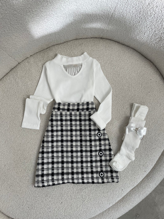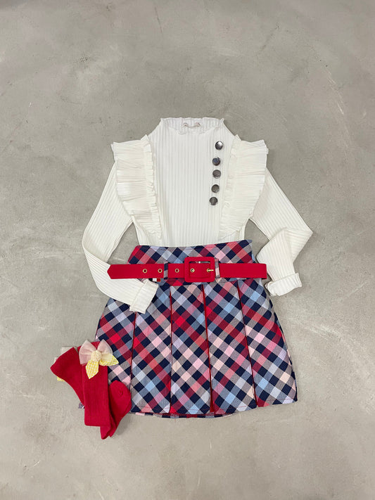 Set me dy pjese. Bluze me kopsa anash dhe fund me kuadrata dhe rrip ne...