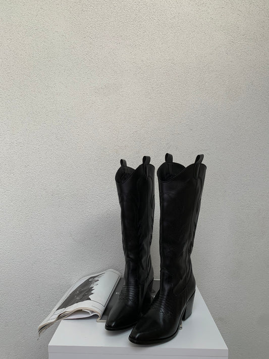 Cizme cowboy, vijne ne ngjyren e zeze. Kane dizenjon me viza, kane pak take. Material...