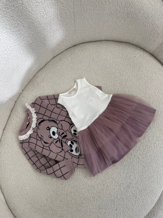 Fustan i shkurter tyl ne pjesen e poshtme. Vjen me pulover me arush perpara. Ka...