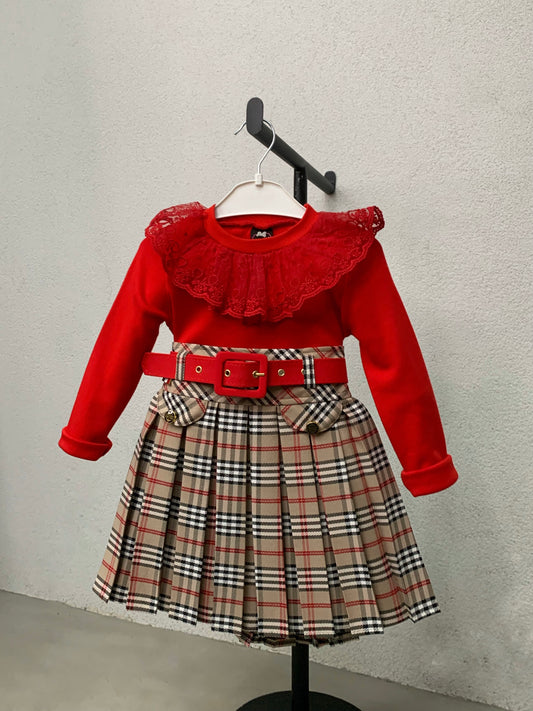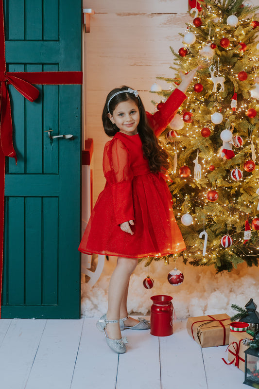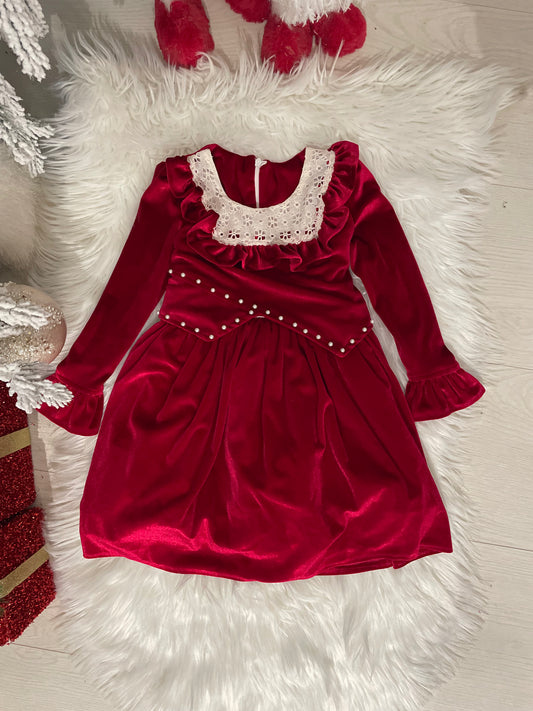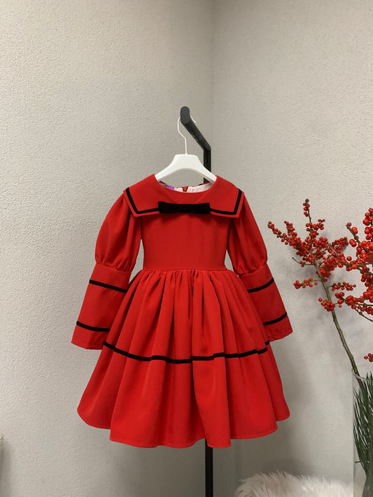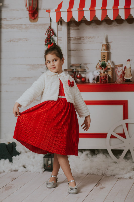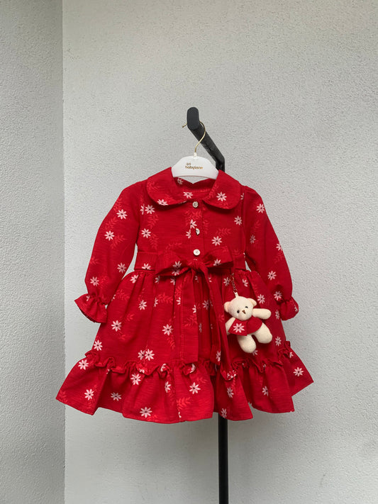 Fustan i kuq me pala dhe arush para. Vjen me detaje me lule dhe kopsa...