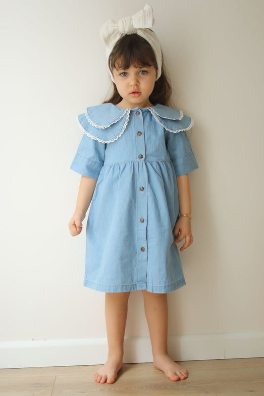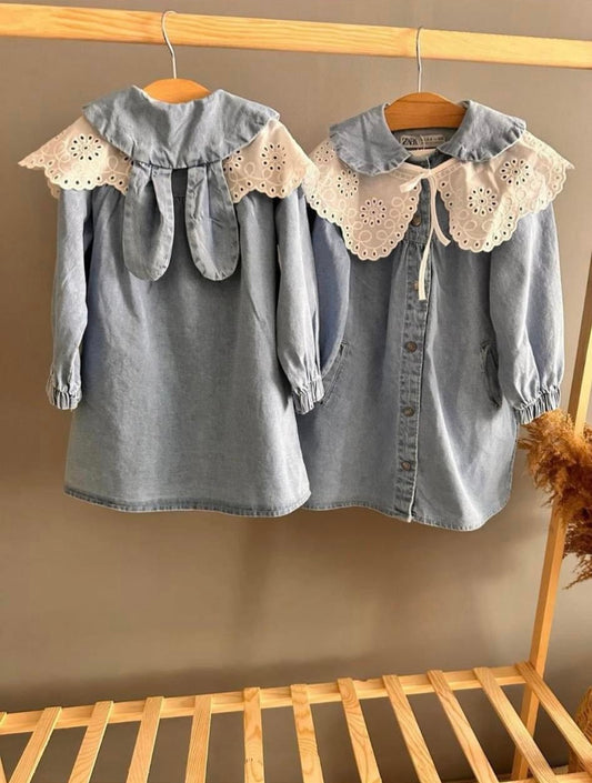 Fustan xhins me kopsa dhe dantelle tek jaka. Ka material te plote dhe cilesi fantastike....