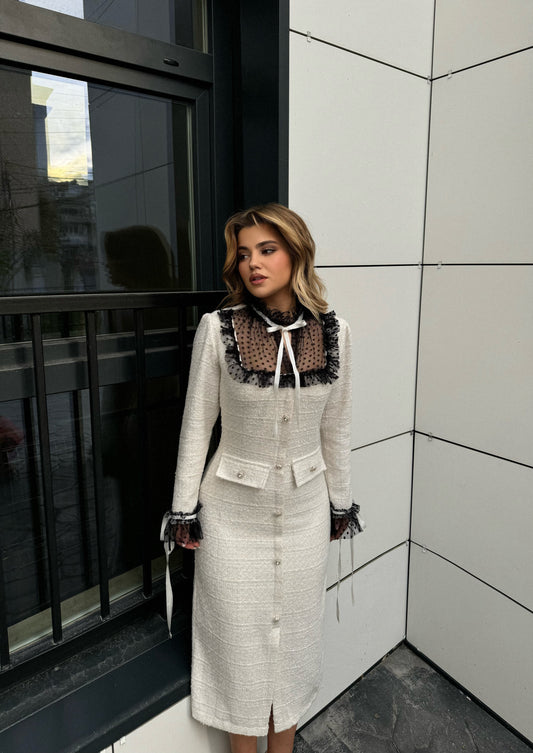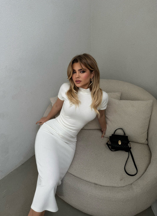 Fustan i shkurter me jaken e bardhe. Material i plote. Pershtatet pas trupit. Vjen me...