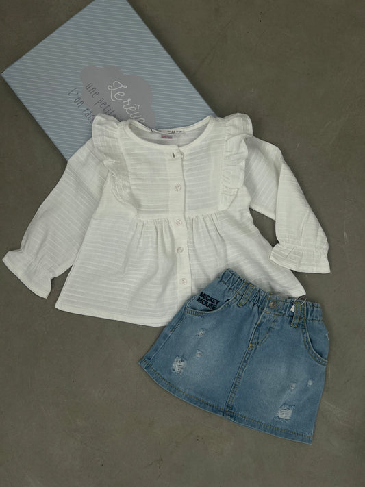 Seti vjen me bluzen dhe fundin. Bluza ka detaje flatrash ne pjesen para. Fundi vjen...
