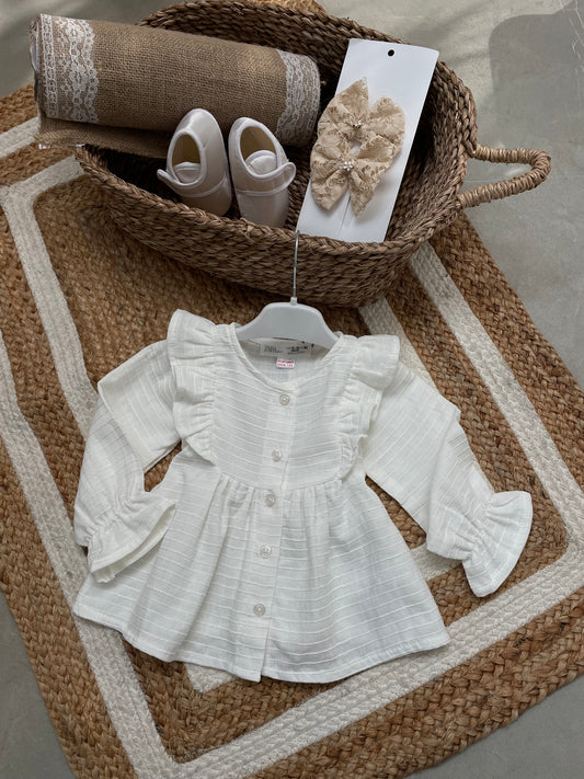 Bluza ka detaje flatrash ne pjesen para. Vjen me kopsa nga fillimi deri ne fund...