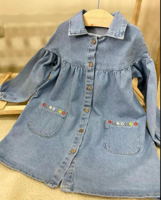 Fustani xhins vjen me dy xhepa ne pjesen para. Ka detaje te luleve ne pjesen...