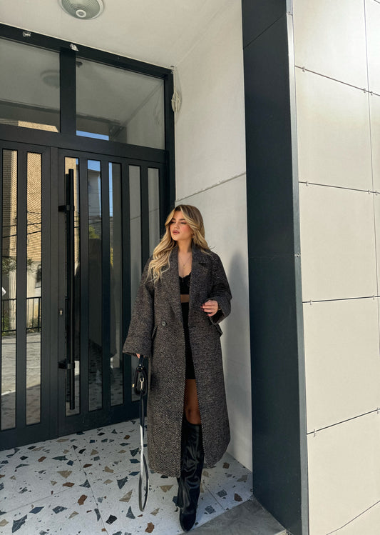 Pallto e gjate stil oversize me kopsa para. Material i plote me astar brenda.