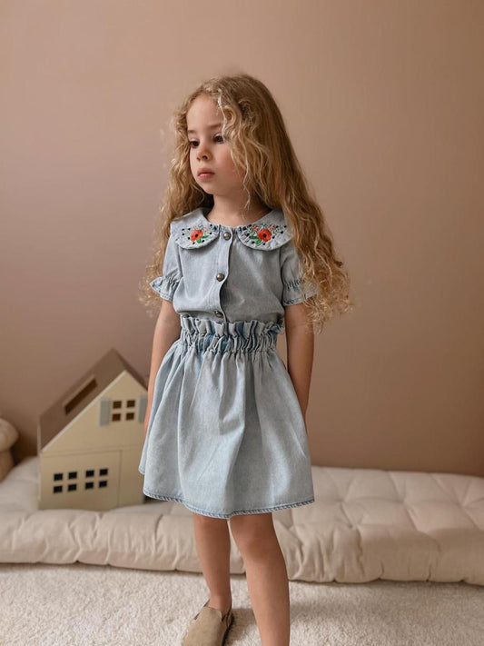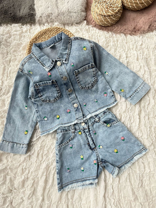 Set xhins me lule te vogla te qendisura. Vjen me xhakete dhe xhinse te shkurtra....