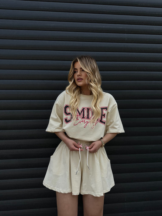 Set sportiv me pantallona te gjera.Bluza vjen stil i lirshem me menge te shkurtera.