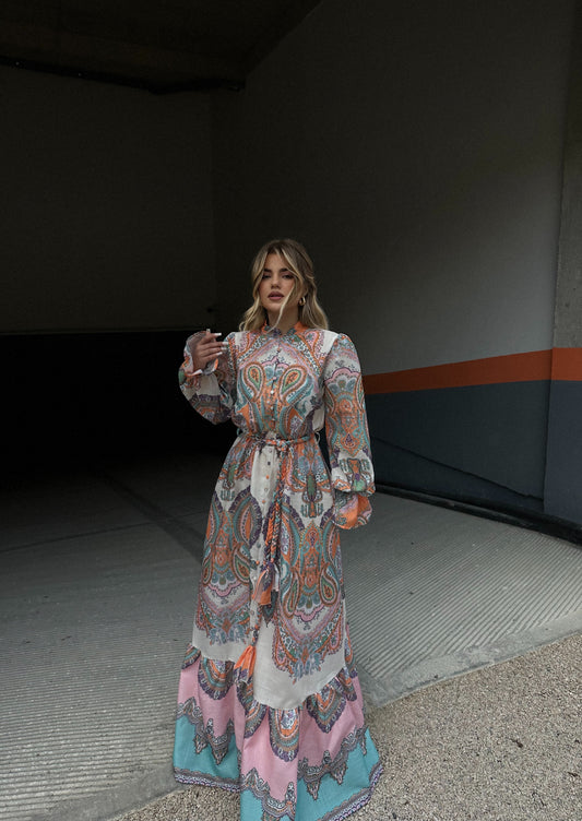 Fustan i gjate me dizenjo.Vjen me menge te gjata.Ka dizenjo ne ngjyra te embla dhe...