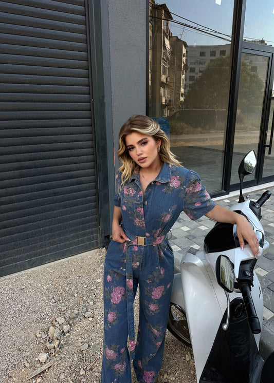 Jumpsuit xhins me lule.Vjen me menge te shkurtera,kopsa ne pjesen para dhe rrip ne bel.Teper...