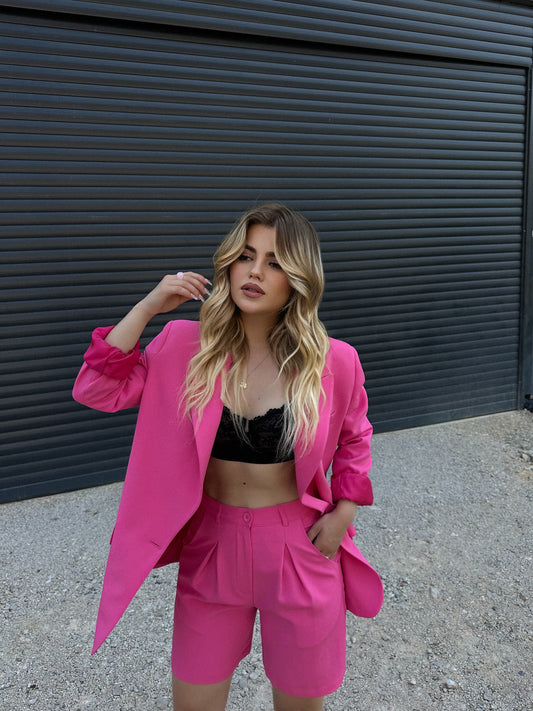 Set klasik xhakete dhe pantallona te shkurter.Xhaketa vjen me menge te gjata,xhepa dhe mbyllja behet...